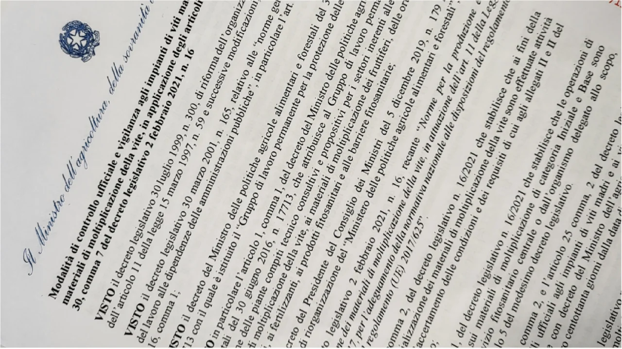 In data 29 novembre 2023 è stato emanato il Decreto Ministeriale recante le modalità di controllo ufficiale e vigilanza agli impianti di viti madri e ai vivai di vite, nonché ai materiali di moltiplicazione della vite, in applicazione degli articoli 24, comma 2, 25, comma 2, e 30, comma 7 del decreto legislativo 2 febbraio 2021, n. 16.